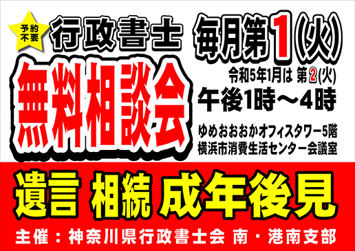 神奈川県行政書士会南・港南支部では、毎月第1火曜日(令和5年1月は第2火曜日) に、上大岡駅(ゆめおおおかオフィスタワー5階 横浜消費生活センター会議室)にて、無料相談会を開催致しますので、お気軽にご利用ください。