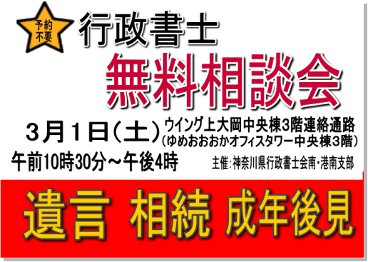 神奈川県行政書士会南・港南支部では、令和6年3月2日(土)午前11時~午後4時半迄の間、京急百貨店ウイング上大岡 3階連絡通路にて、無料相談会を開催致しますので、お気軽にご利用ください。